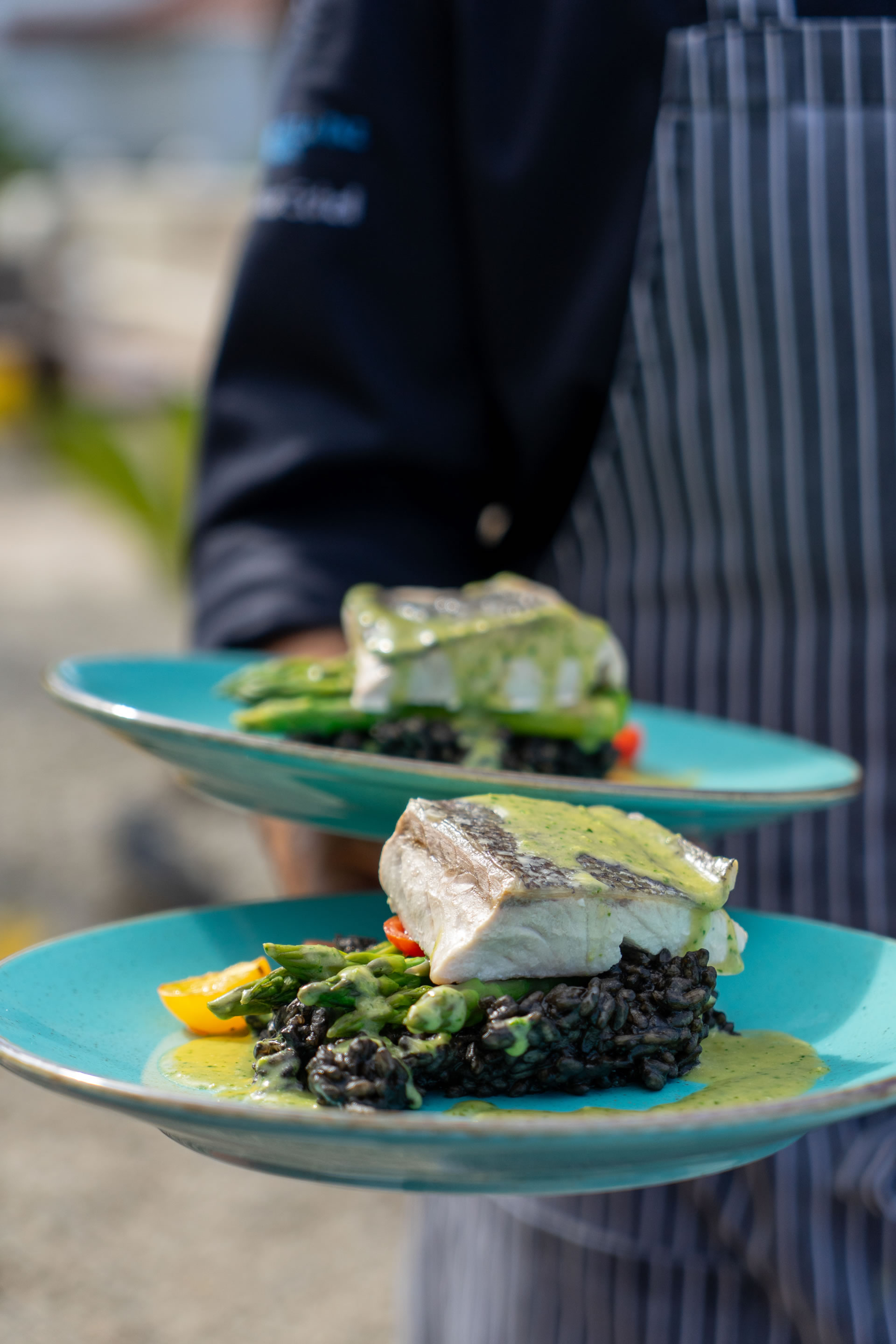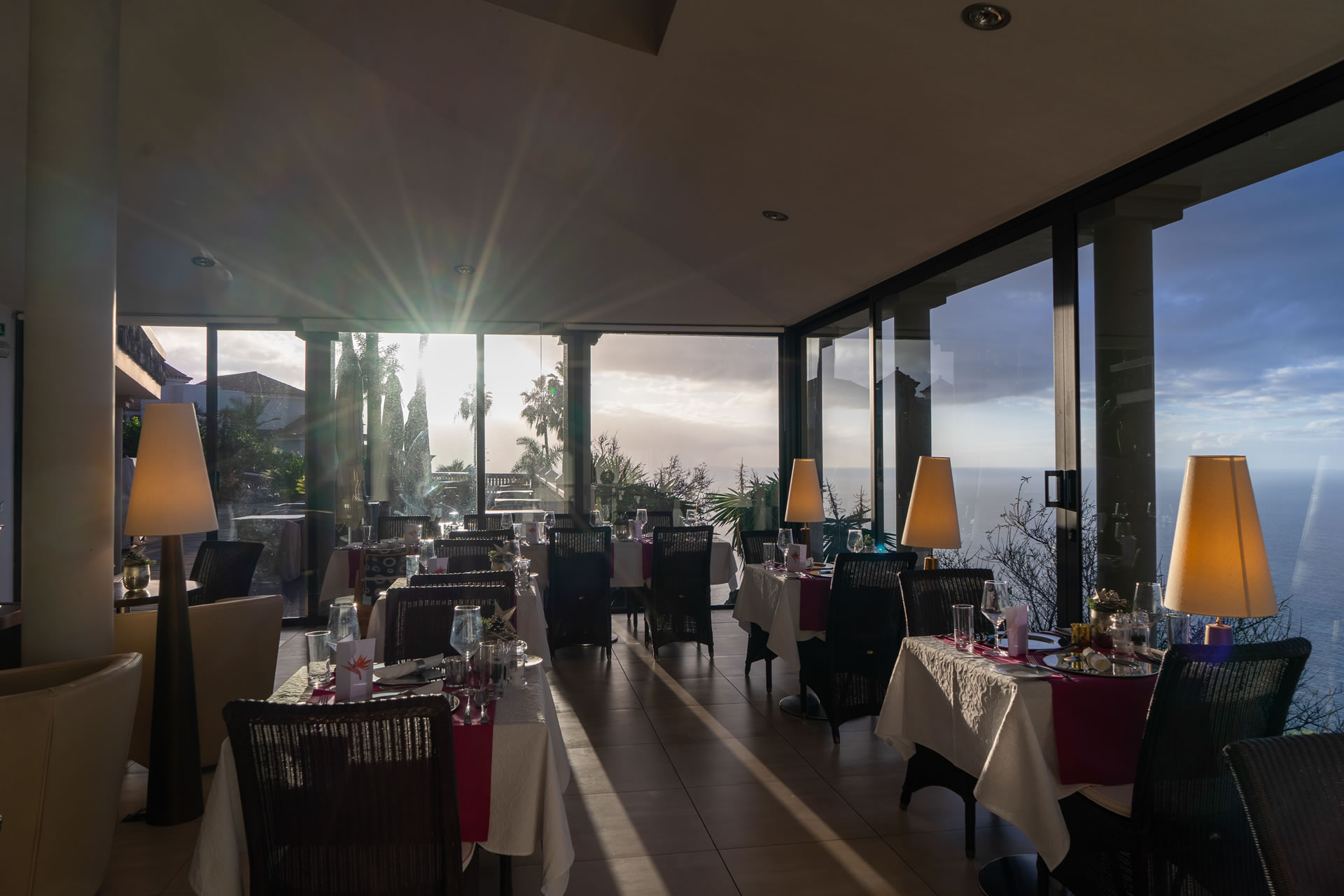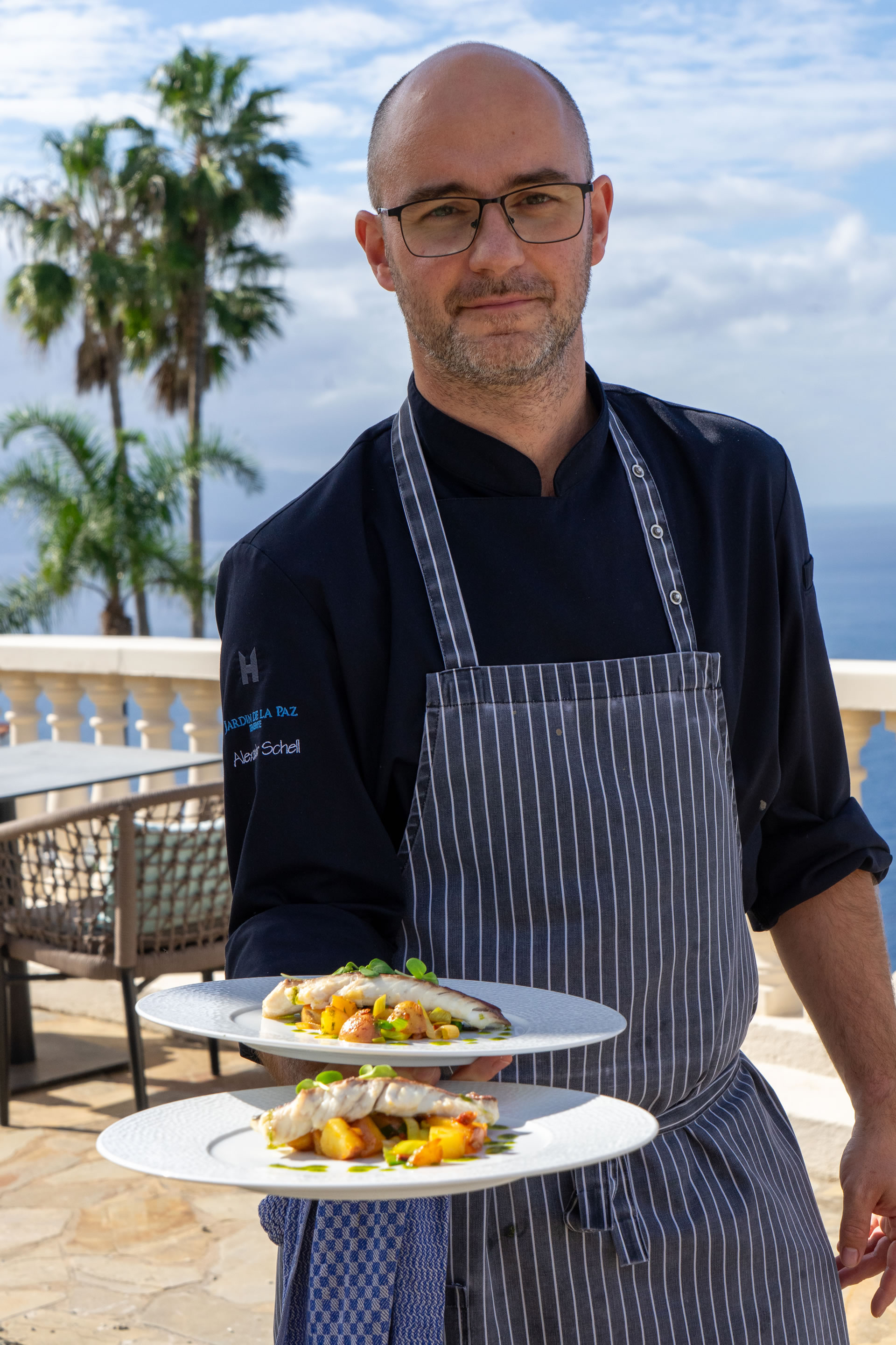 The philosophy of Resort Jardin de la Paz includes our wish for our guests to experience peace, relaxation, and inspiration. Personalised addressing, attention to details, and helping you create a truly beautiful holiday memory are important to us. Our hotel restaurant, which is exclusively available to our in-house guests, completes our offer for a successful vacation. Our head chef Alexander Schell creates weekly menus that combine creativity and seasonality. The ingredients are carefully selected; among our suppliers is, for example, a bio finca from La Orotava, from which we receive exceptional fruits and vegetables. Typically, three courses, with a Spanish greeting from the kitchen in advance, which you can enjoy in our “Pavilion Vista Paraíso.” The restaurant’s name comes from the exceptionally beautiful view you have from there of the wide sea. Depending on the temperature, we set the tables for you either on our sea-view terrace or inside at one of the tables directly by the large panoramic windows. For a starter, for example, grilled watermelon with shrimp and a light lemon dressing; for the main course, a typically Spanish Presa Ibérica with rosemary jus on sweet potato purée with purple cauliflower from the bio finca, or Corvina fish on black rice with green asparagus and braised tomatoes; and for dessert, tonka bean mousse with raspberry droplets or a reinterpretation of the Merienda Canaria. In the photos you can see examples of beautiful plates freshly prepared for our guests at Jardin de la Paz. All menus are lovingly tailored to your quiet, indulgent time away and convey the feeling of a relaxing, upscale vacation experience.