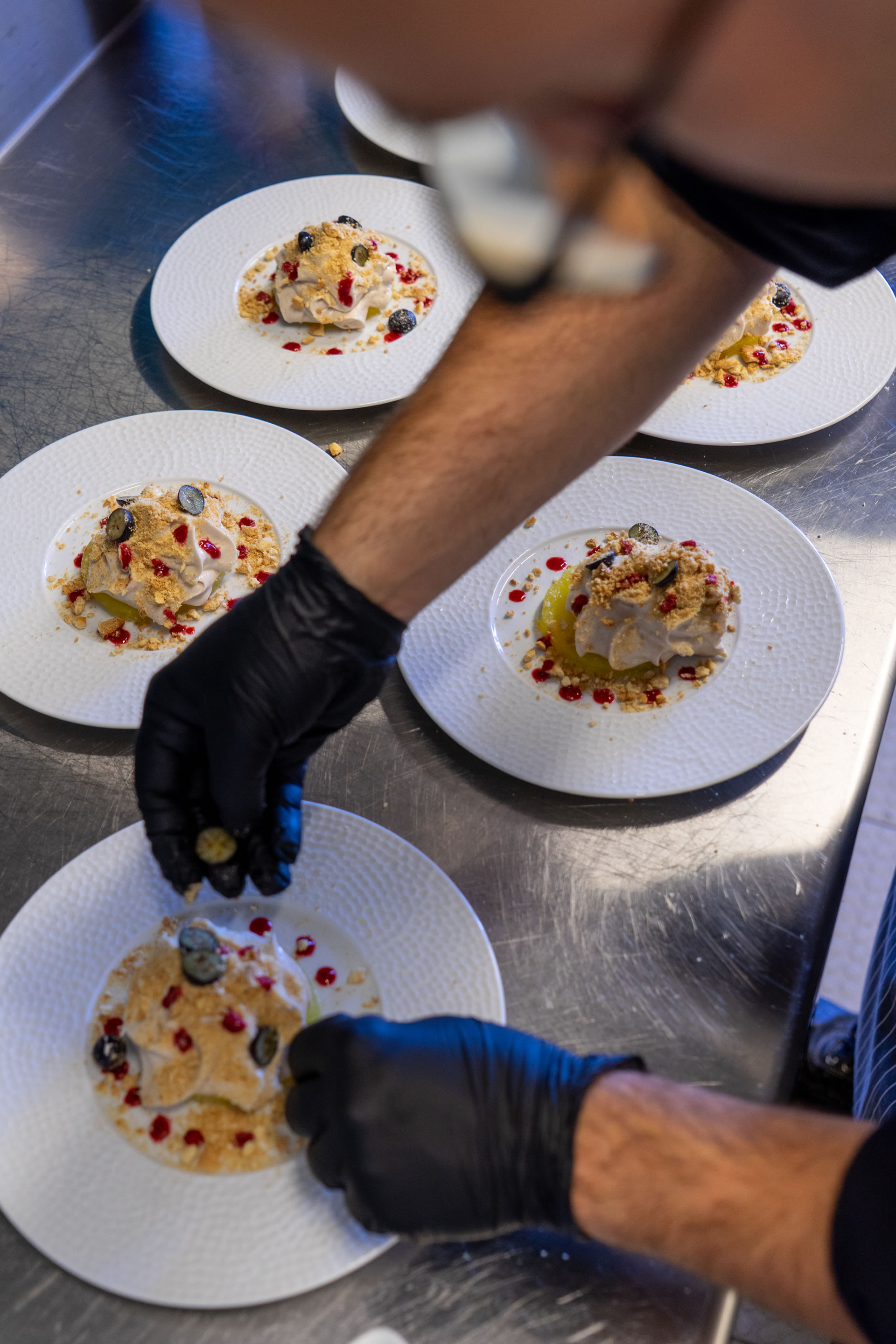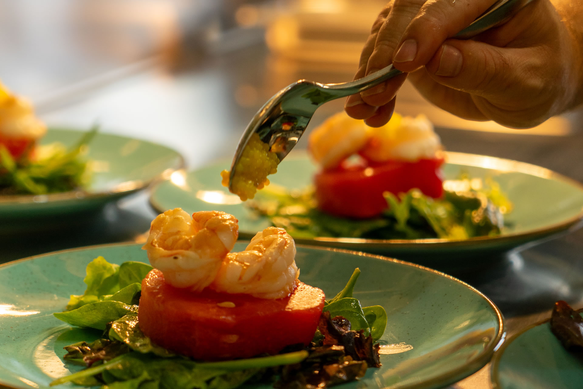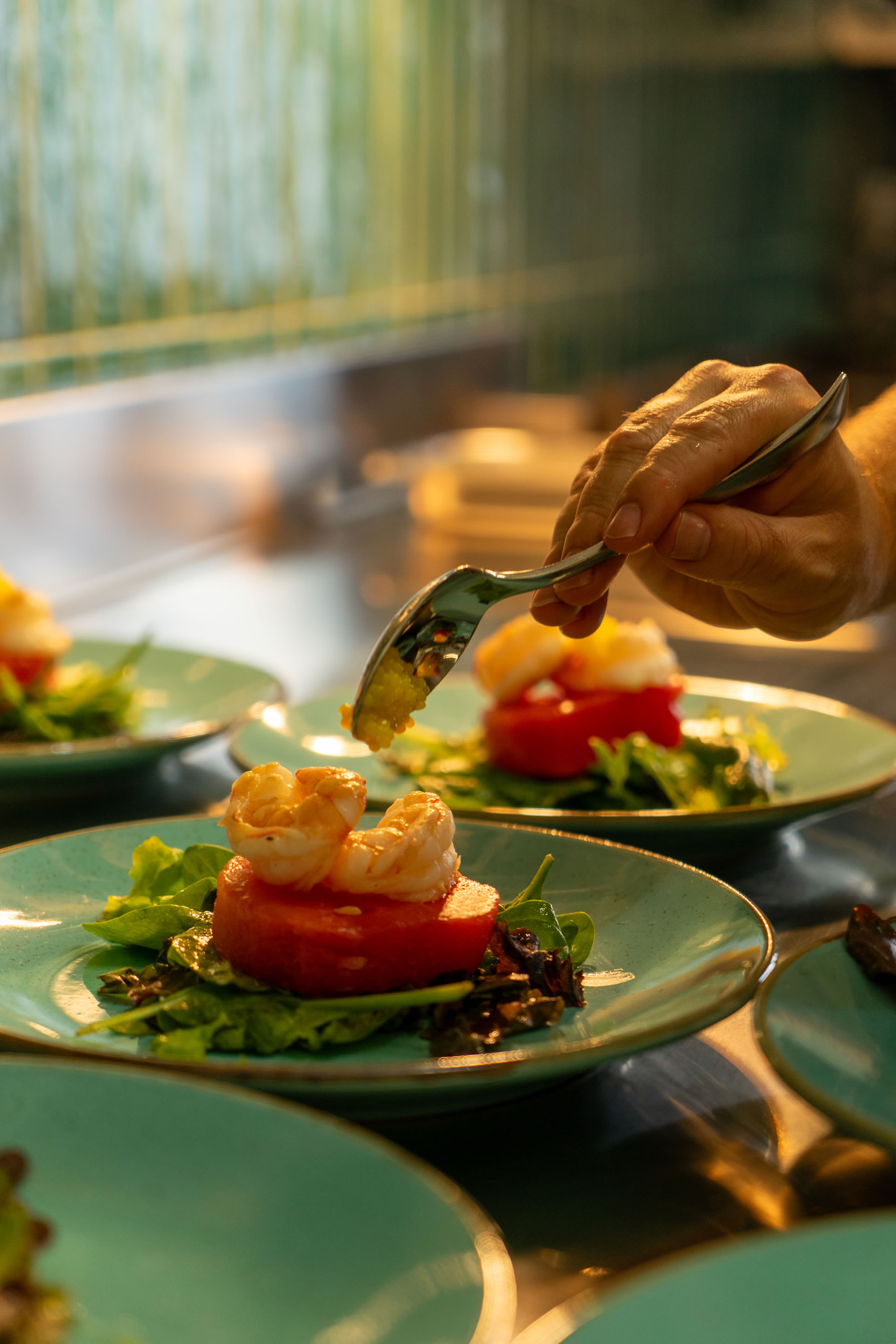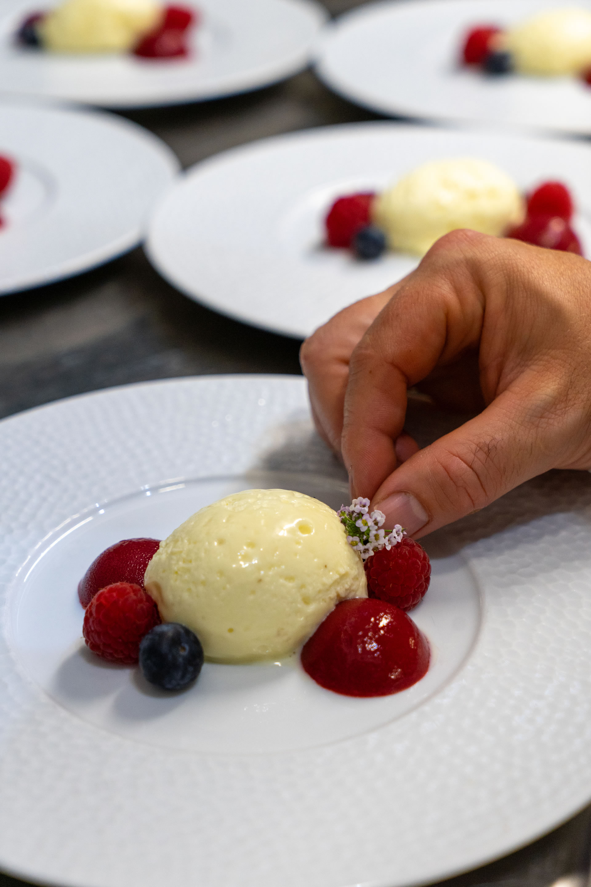 The philosophy of Resort Jardin de la Paz includes our wish for our guests to experience peace, relaxation, and inspiration. Personalised addressing, attention to details, and helping you create a truly beautiful holiday memory are important to us. Our hotel restaurant, which is exclusively available to our in-house guests, completes our offer for a successful vacation. Our head chef Alexander Schell creates weekly menus that combine creativity and seasonality. The ingredients are carefully selected; among our suppliers is, for example, a bio finca from La Orotava, from which we receive exceptional fruits and vegetables. Typically, three courses, with a Spanish greeting from the kitchen in advance, which you can enjoy in our “Pavilion Vista Paraíso.” The restaurant’s name comes from the exceptionally beautiful view you have from there of the wide sea. Depending on the temperature, we set the tables for you either on our sea-view terrace or inside at one of the tables directly by the large panoramic windows. For a starter, for example, grilled watermelon with shrimp and a light lemon dressing; for the main course, a typically Spanish Presa Ibérica with rosemary jus on sweet potato purée with purple cauliflower from the bio finca, or Corvina fish on black rice with green asparagus and braised tomatoes; and for dessert, tonka bean mousse with raspberry droplets or a reinterpretation of the Merienda Canaria. In the photos you can see examples of beautiful plates freshly prepared for our guests at Jardin de la Paz. All menus are lovingly tailored to your quiet, indulgent time away and convey the feeling of a relaxing, upscale vacation experience.